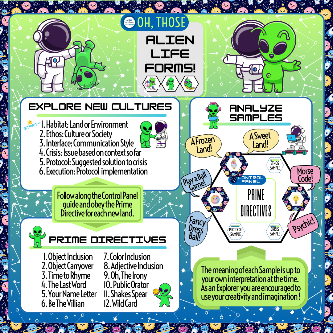 What makes this game different from other story telling games is that by exploring alien life forms you may find that you share so much in common, and this helps build connections. As neurodivergent creators we have sometimes felt as if we were either aliens ourselves or as if we were observing an alien society. We created Oh, Those Alien Lifeforms! as a loving and fun play on our shared experience.