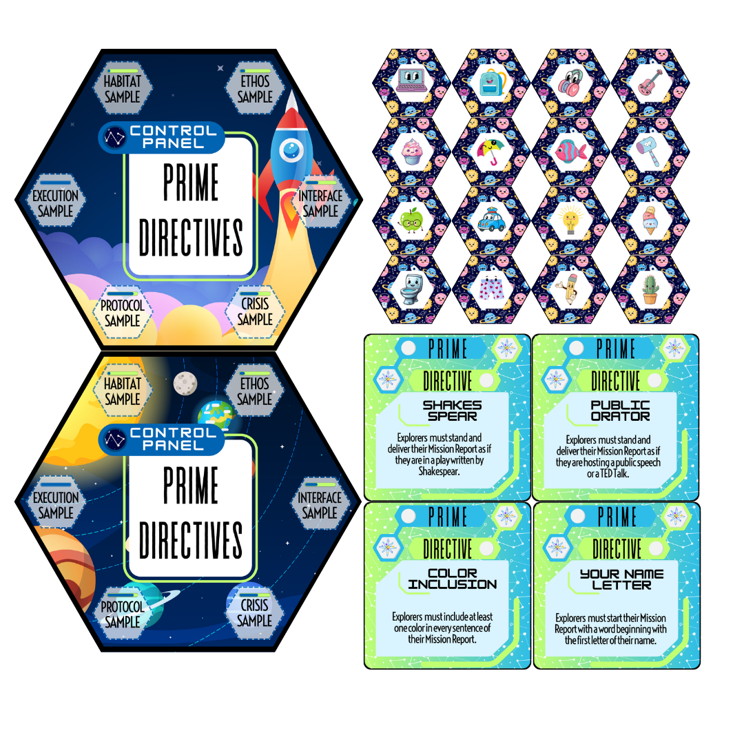 You‘re a Sci-Fi Scientist exploring new lands. Your mission is to send Reports back to the Mother Ship. Collect Samples from each new land in order to create a story about what the aliens are up to and include this in your Mission Report. Make sure to follow the Prime Directive which changes with each new land you explore.